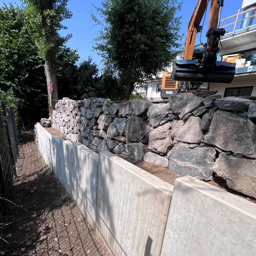 Wir setzen Randeinfassungen und Natursteinmauern, darunter EL-Steine als Stützmauern oder Hangabsicherungen, Kantensteine für Wege und Straßenränder sowie individuell gestaltete Natursteinmauern für den Garten- und Landschaftsbau.